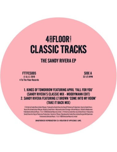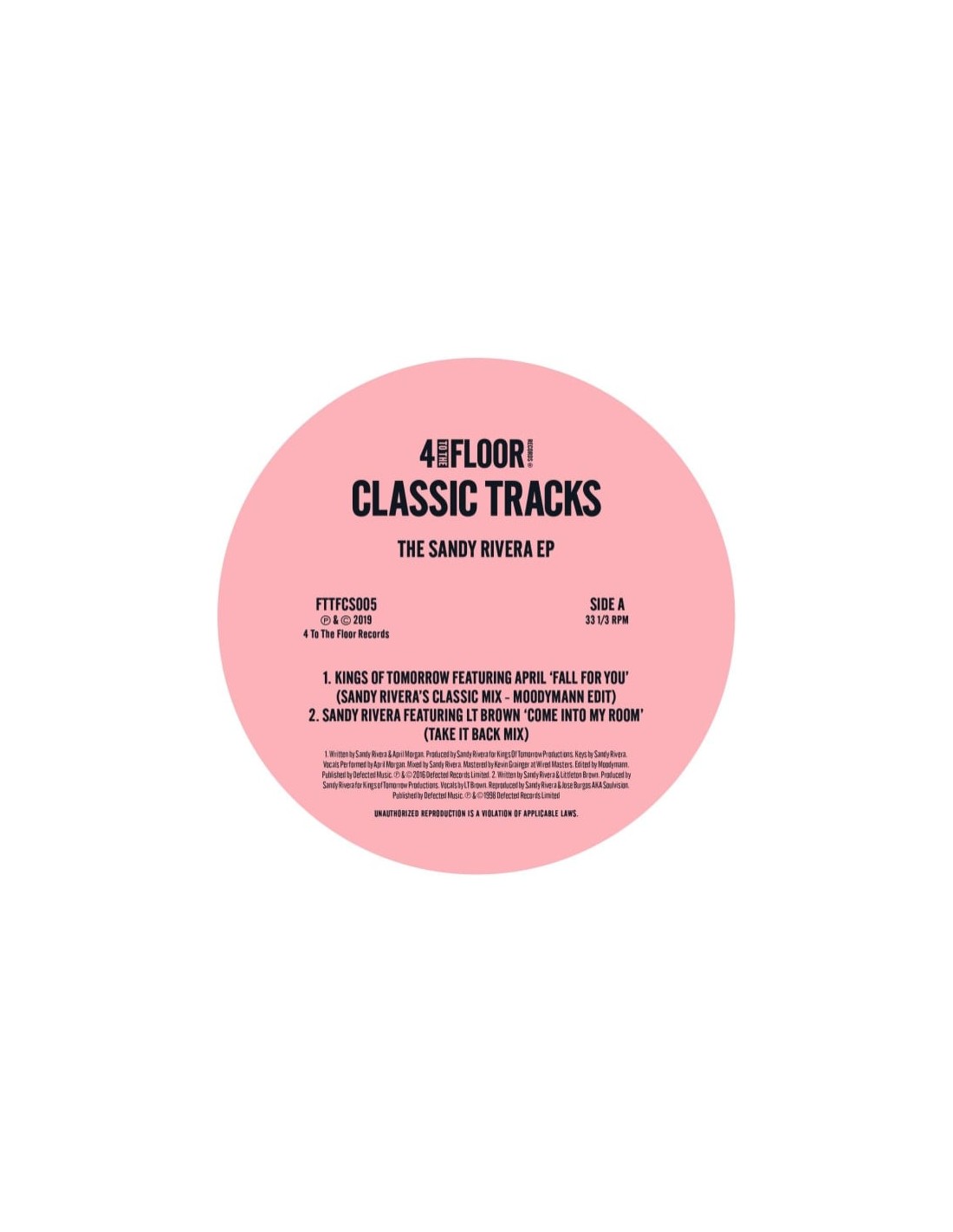 4 To The Floor is committed to delivering seminal house music to wax, making sought after heritage tracks readily available on vinyl for crate diggers to add to their collections. The fourth edition of the series pays homage to one of the most loved names in house music – Sandy Rivera. Known for his soulful dancefloor cuts he has produced timeless classics, with his long-lasting career and multitude of aliases captured by this 12” release. Opening the A-side is the Moodymann Edit of Kings of Tomorrow’s ‘Fall For You’, featuring the stunning vocals of long-time collaborator April Morgan, followed by Sandy’s grooving ‘Come Into My Room’ which features LT Brown. On the flip is Soul Vision’s ‘Don’t Stop’ with its atmospheric strings and gospel vocal. The release is closed with Kings Of Tomorrow featuring Elzi Hall ‘Show Me’, an atmospheric club cut that shows the versatility of this house legend
