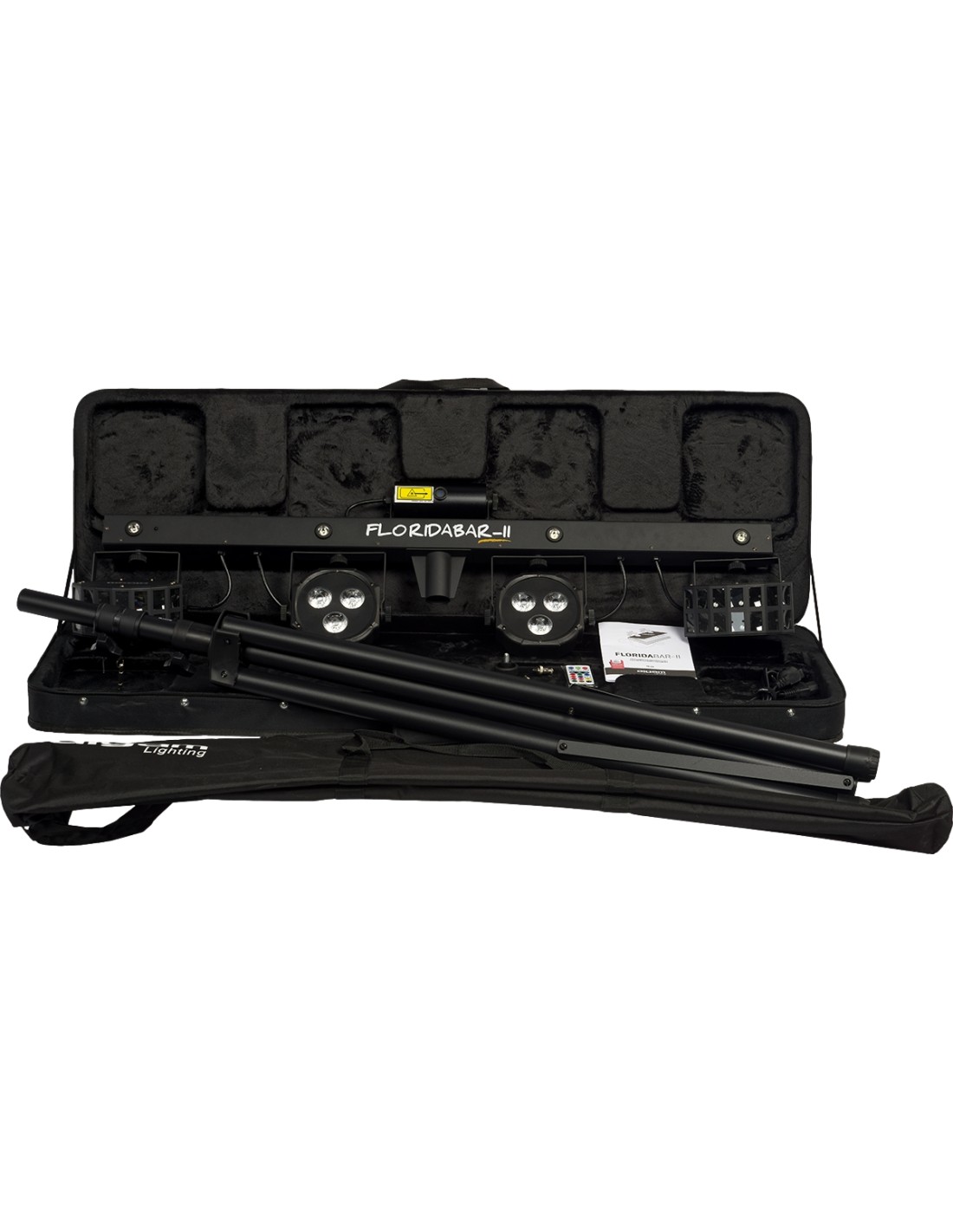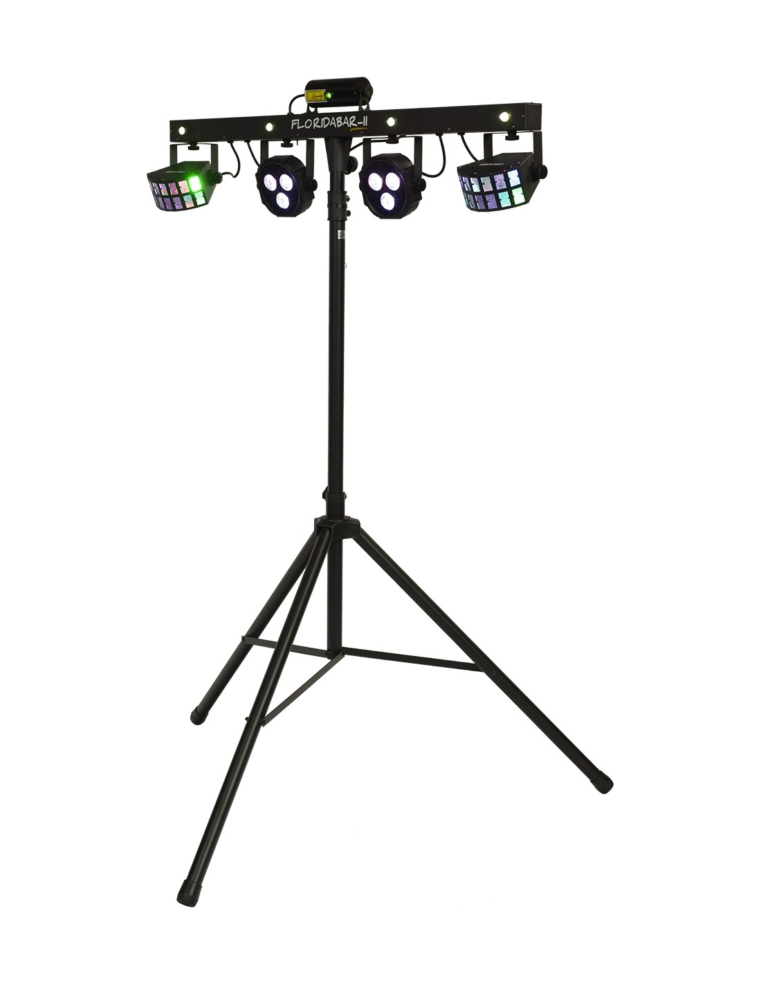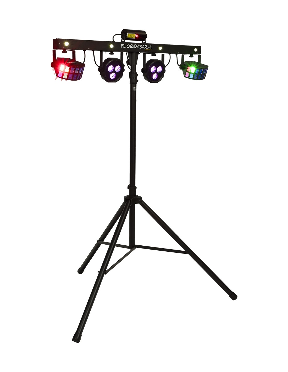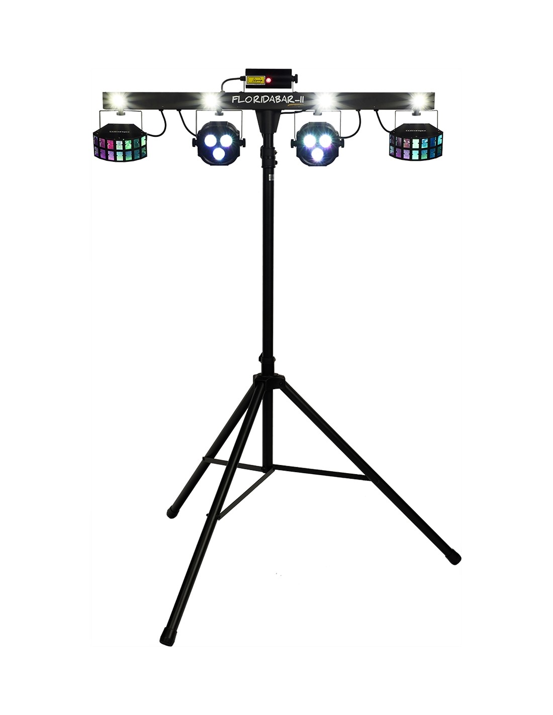 The Florida Bar II is a 4-in-1 lighting system that provides a powerful animation solution for DJs, mobile discos, bands, and private events. Comprising 2 RGB PAR LEDs and 2 Derby effect projectors, the Florida Bar II also features a RG laser and a strobe effect provided by 4 white LEDs, ensuring impactful performances. This complete system sets up in moments on its sturdy telescopic tripod, minimizing installation time needed.